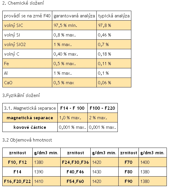1. Černý karbid křemíku se vyrábí redukcí oxidu křemíku uhlíkem, která probíhá při dostatečně vysokých teplotách v elektrických odporových pecích. Po odtřídění jemně krystalického nezreagovaného produktu se kusový karbid křemíku drtí, mele, pere ve vodě, magnetuje a třídí na sítech na brousící zrna velikosti F14 až F220.