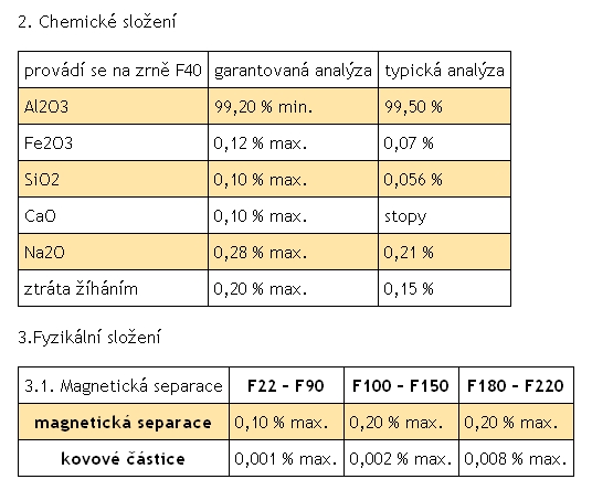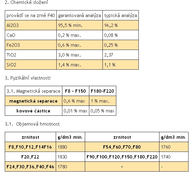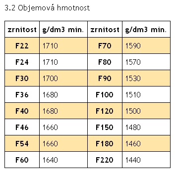 Zrnitostní složení zrn 99 A I b F22 až F 220 musí odpovídat požadavkům normy FEPA standard 42-D-1984. Po dohodě lze v rámci technologických možností dodat i zrnitostní směsi.